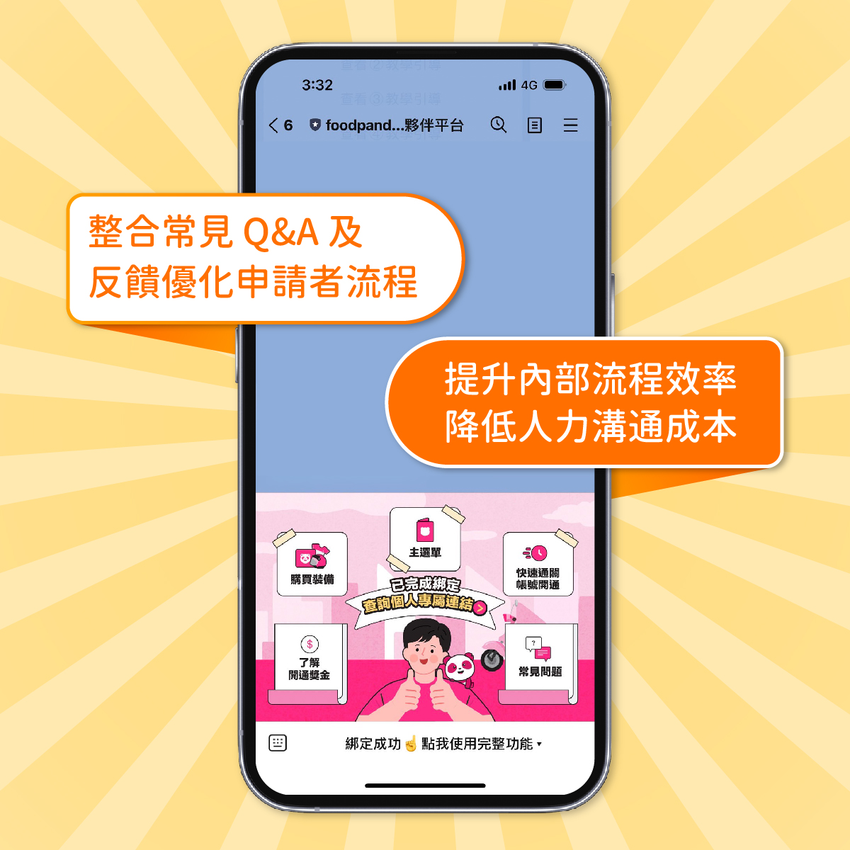 疫情期間點外送逐漸生活化,疫後更成為國人的剛性需求。foodpanda 為全台市佔最高的外送平台,讓申請者透過 LINE 官方帳號獲得個人申請連結與進度通知,來『拉近與申請者間的溝通距離』,協助申請者於 2-3 天內成功開通並上線,蒐集反饋及整合常見 Q&A 來優化申請流程,進而提升內部流程效率,降低人力溝通成本,讓申請者能更快速完成申請步驟。
