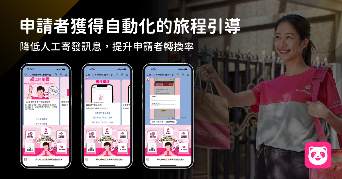 foodpanda 貫穿 LINE 管道,解決過去與申請者溝通即時性問題。未來致力於提升申請者應用自動化旅程體驗,降低多種管道資訊,導入更多申請所需查詢資訊界面,並一站式整合申請者溝通渠道、深化申請者緊密度。