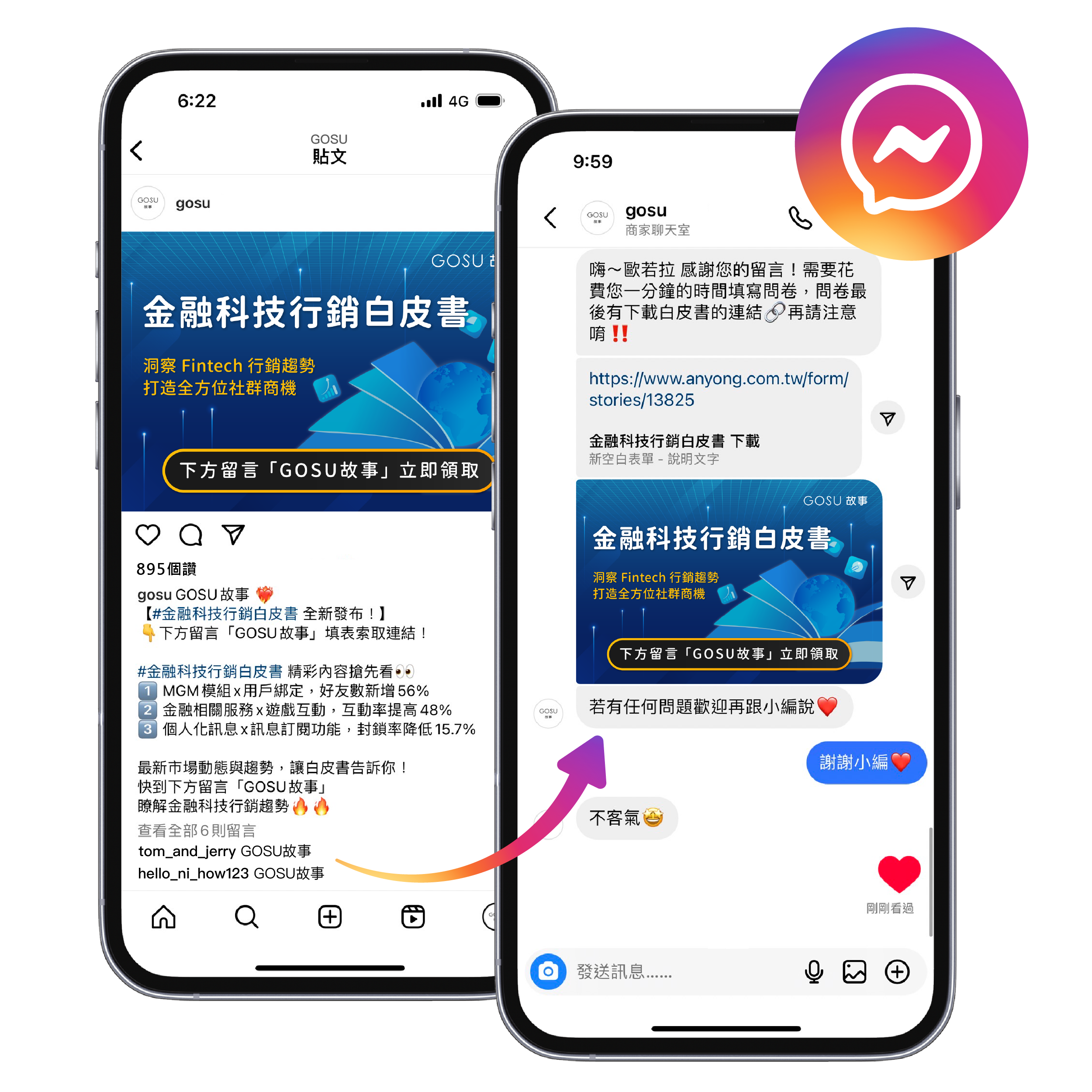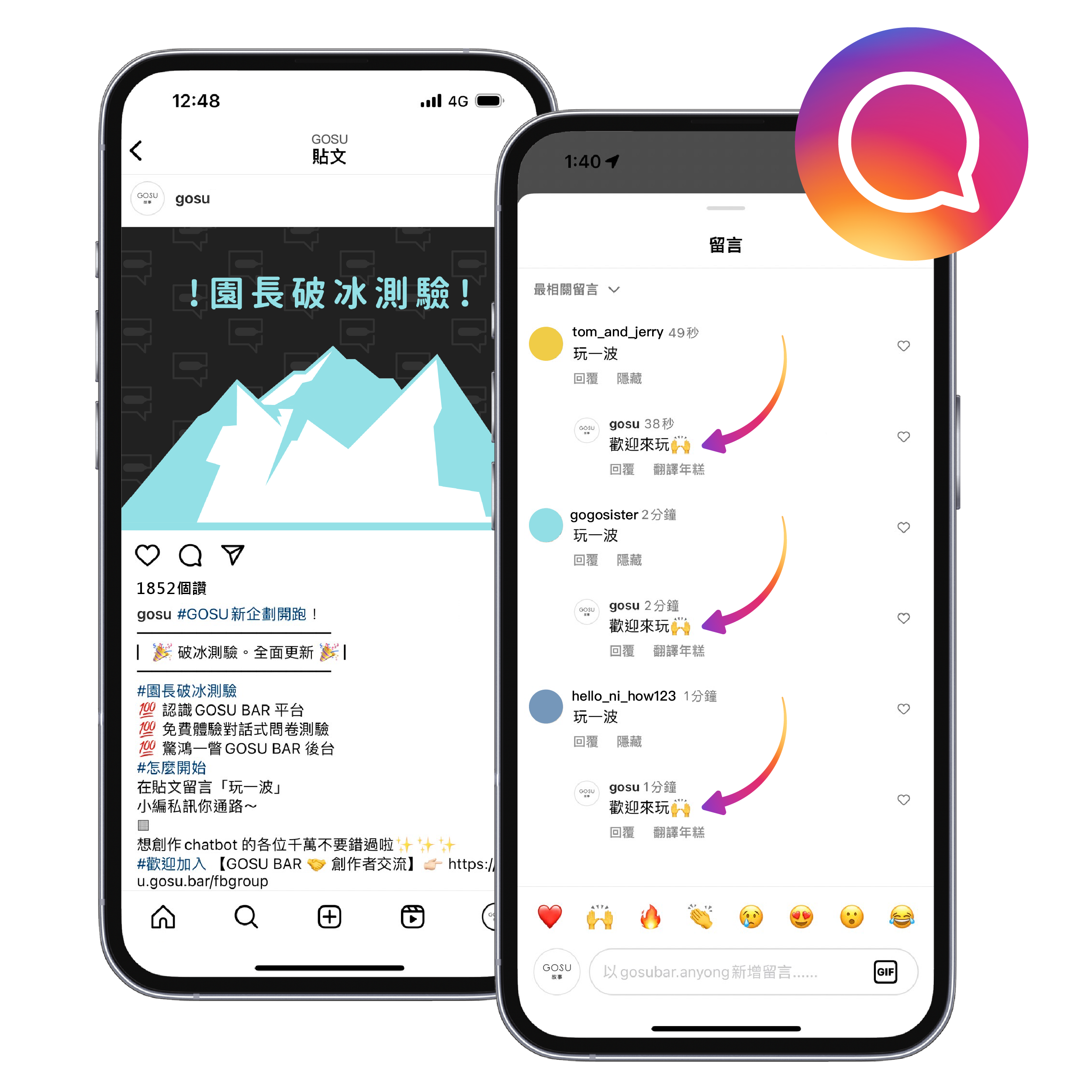 使用 GOSU BAR 平台設置關鍵字後,粉絲於貼文下方留言指定的關鍵字,貼文就會自動回覆,是心理測驗與抽獎經常使用的功能,『自動回覆留言』除了可以節省您的人力回覆成本外,也能提升與粉絲之間的黏著度,進而提高品牌好感度!