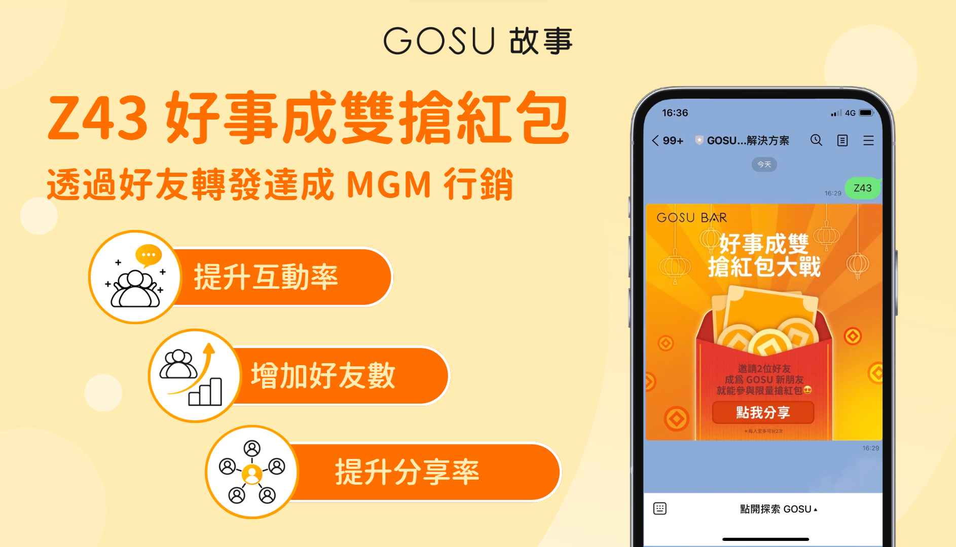 透過 GOSU BAR 建立品牌專屬的互動內容、任務獎勵,讓好友「主動」且「積極」的參與互動及分享給好友,讓活動、商品資訊透過 MGM 分享如蒲公英般的擴散出去!透過豐富有趣的體驗內容,強化好友對品牌的忠誠度、拉近彼此間的距離。