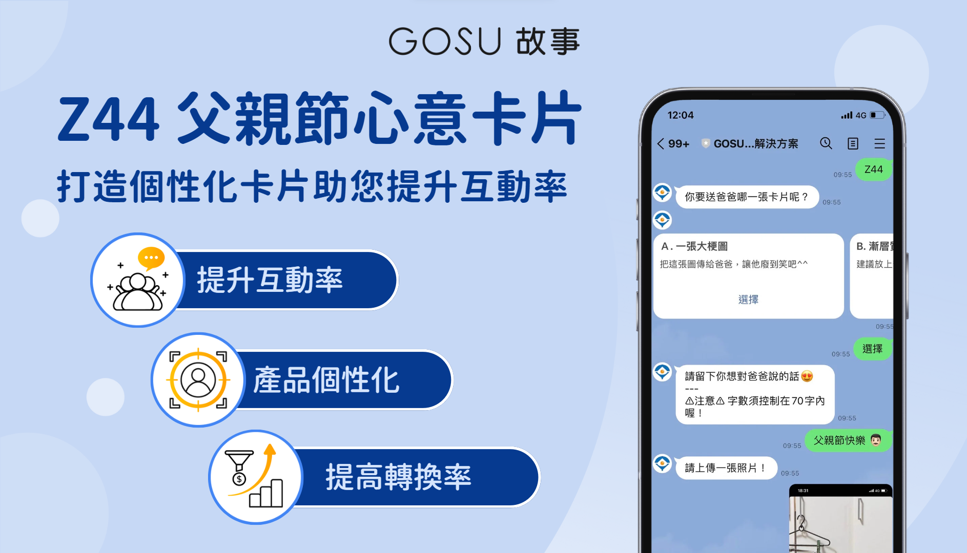 父親節來啦!讓客戶可以隨心所欲地設置圖片、輸入卡片內容,在 LINE OA 輕鬆打造送給父親的個性化卡片,藉此提高與客戶的互動率!此外,您也能提供禮品推薦,協助客戶快速找到符合父親需求的禮品,提高產品購買量及轉換率。