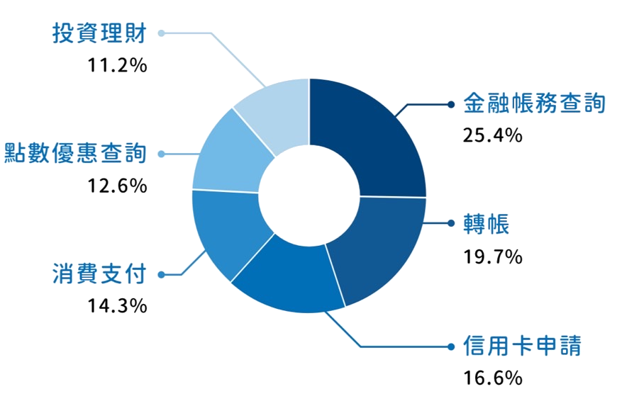 面對瞬息萬變的使用者需求與行銷趨勢,金融業者將以貼近使用者日常、打造便利完整的數位服務為目標,結合科技與社群進行數位轉型!根據內政部 2023 年的統計顯示,銀行 APP 中的金融帳務查詢、轉帳、信用卡申請是前三大最常被使用的功能。