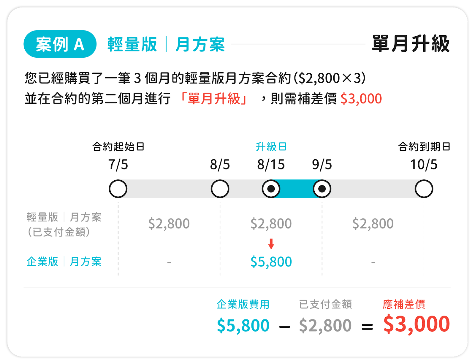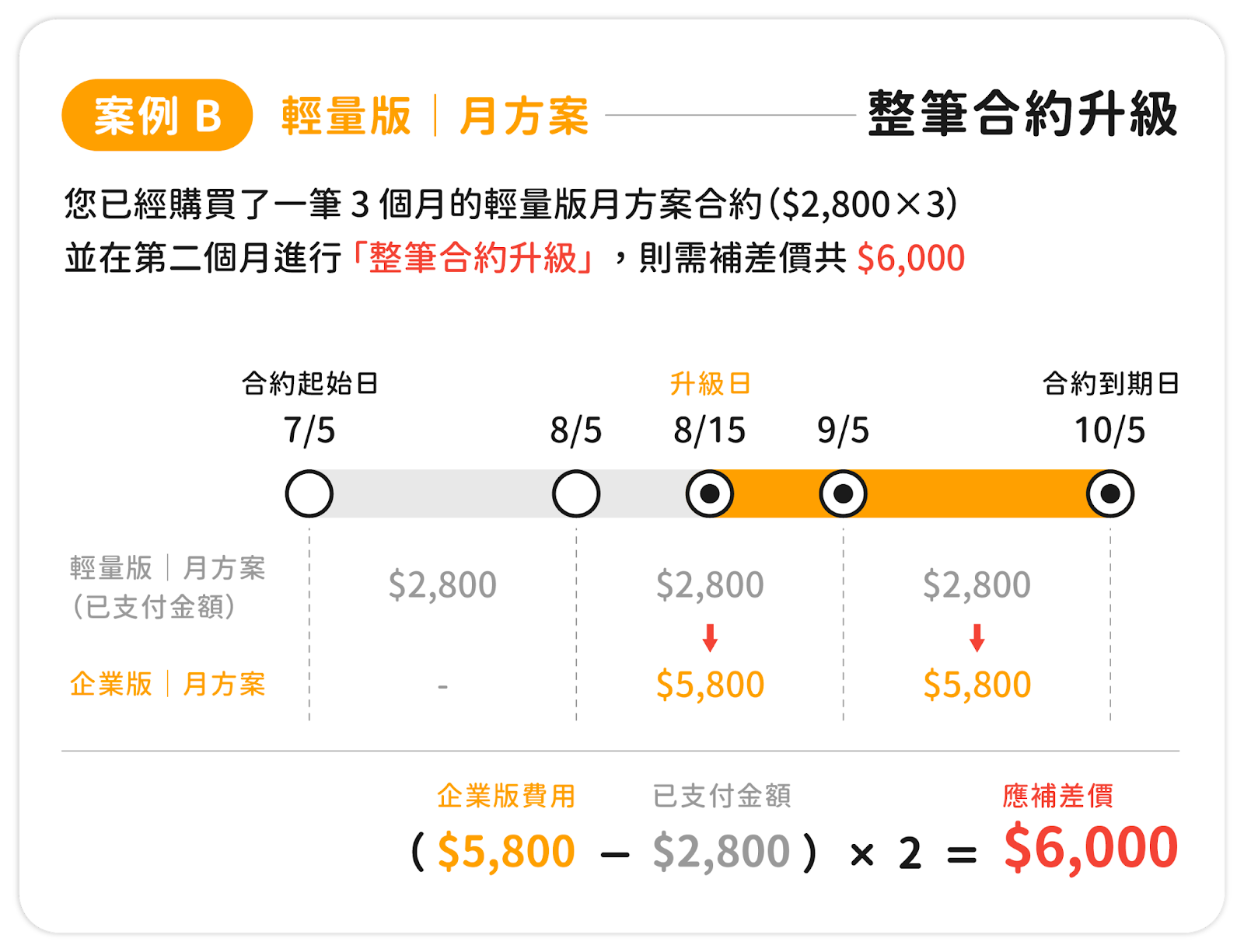 產生費用:扣除您在初次購買時已經支付的部分,尚需補足企業版月費($5,800/月)