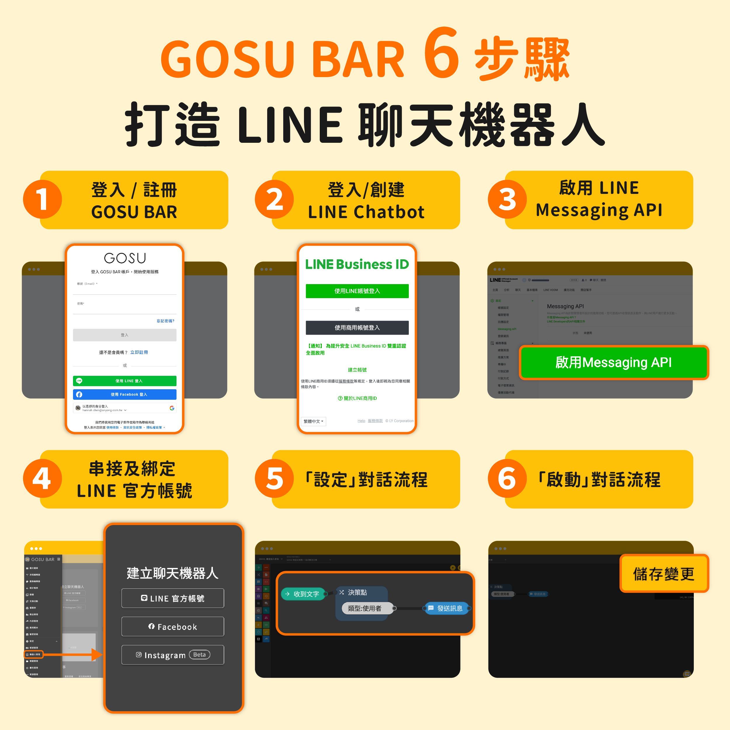 使用 GOSU BAR 製作 LINE Chatbot 僅需以下幾個步驟: