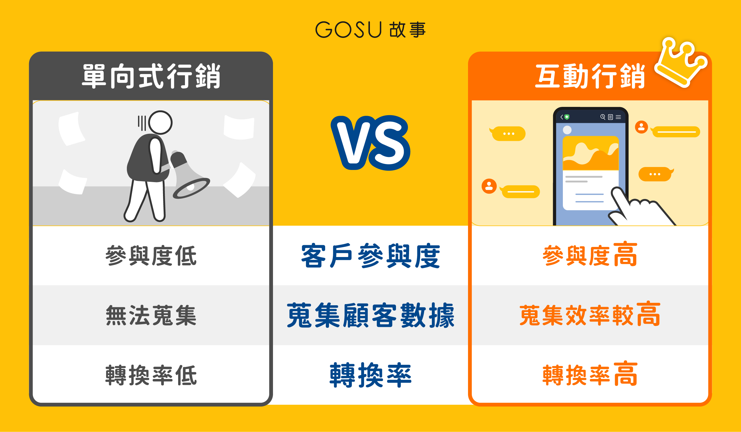 「互動行銷」與傳統的「單向行銷」相比,「互動行銷」更加注重「個性化體驗」與「數據驅動的決策過程」。「互動行銷」會利用社交媒體、網站、電子郵件及各類數位平台,來進行消費者深度溝通。透過以上方式,品牌端能更加了解消費者需求,並量身定制解決方案,最終達到提高顧客滿意度與忠誠度之目標。