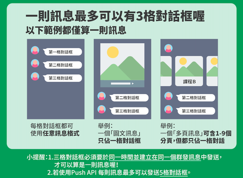 收費僅適用於「群發訊息」與透過 Messaging API 推送的進階 Push 訊息;