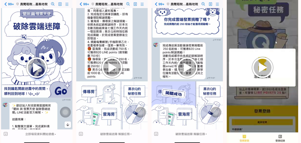 民眾只要打開 LINE,進入各種情境闖關的遊戲中,就能自然地完成「發票登錄」與「租稅相關知識」學習。透過 GOSU 的「發票任務模組」,以及「LINE POINTS 點數贈獎」誘因,原本難以啟動的發票活動,變成可設計、可追蹤、可放大且趣味滿滿的互動流程。