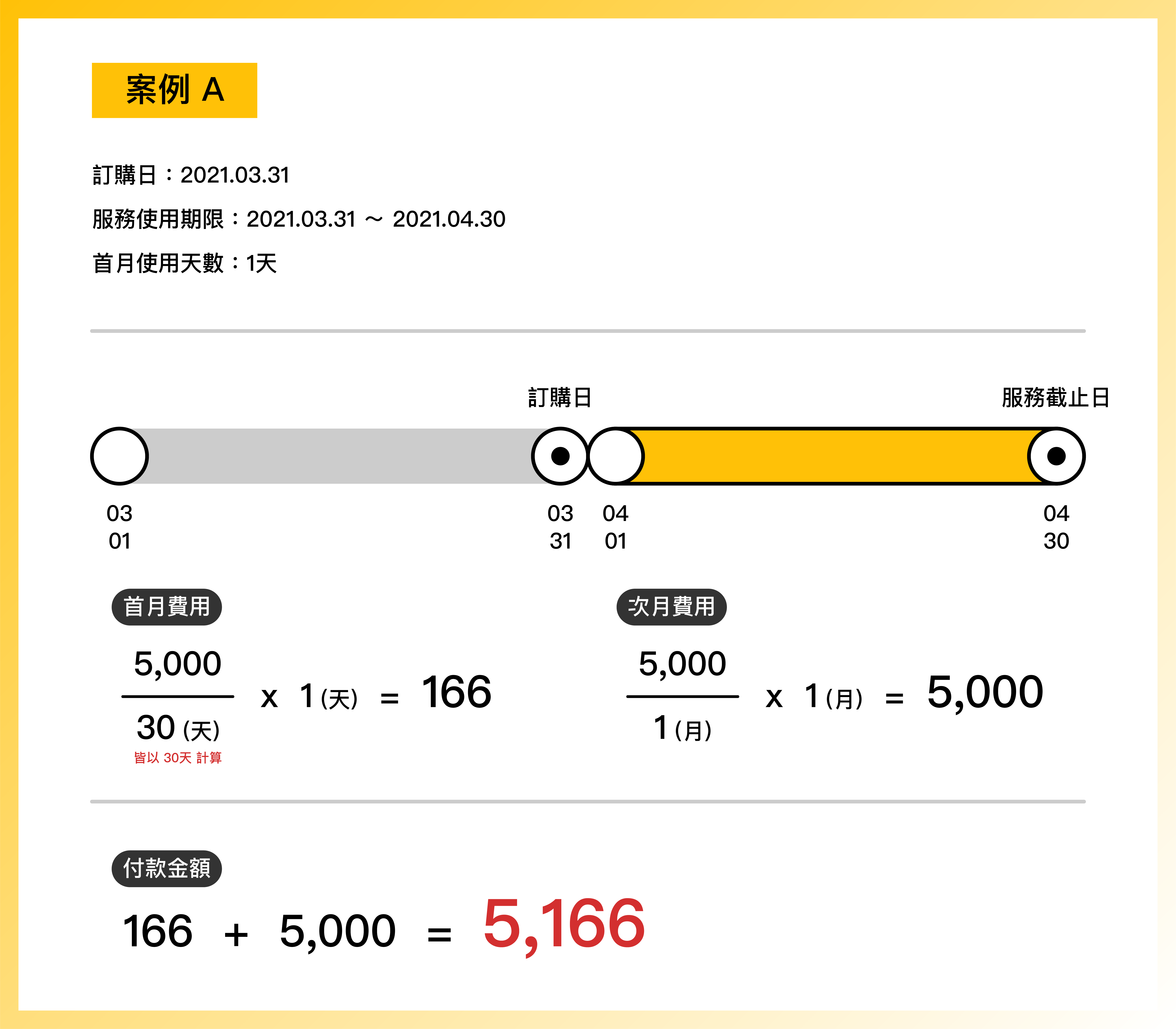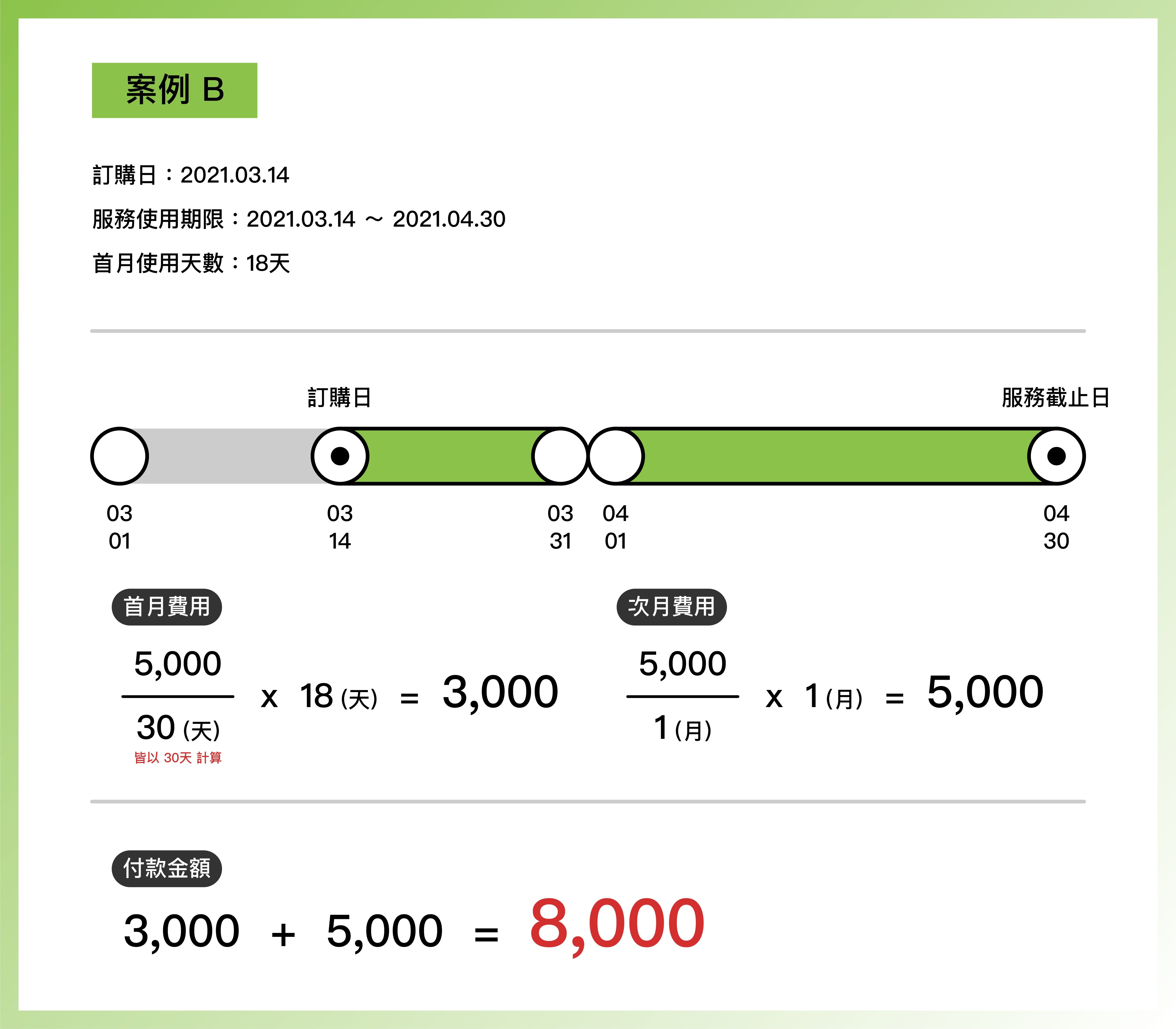 如〈案例 B 〉所示,首月費用統一以使用天數進行計算,次月費用則固定為 $5,500。