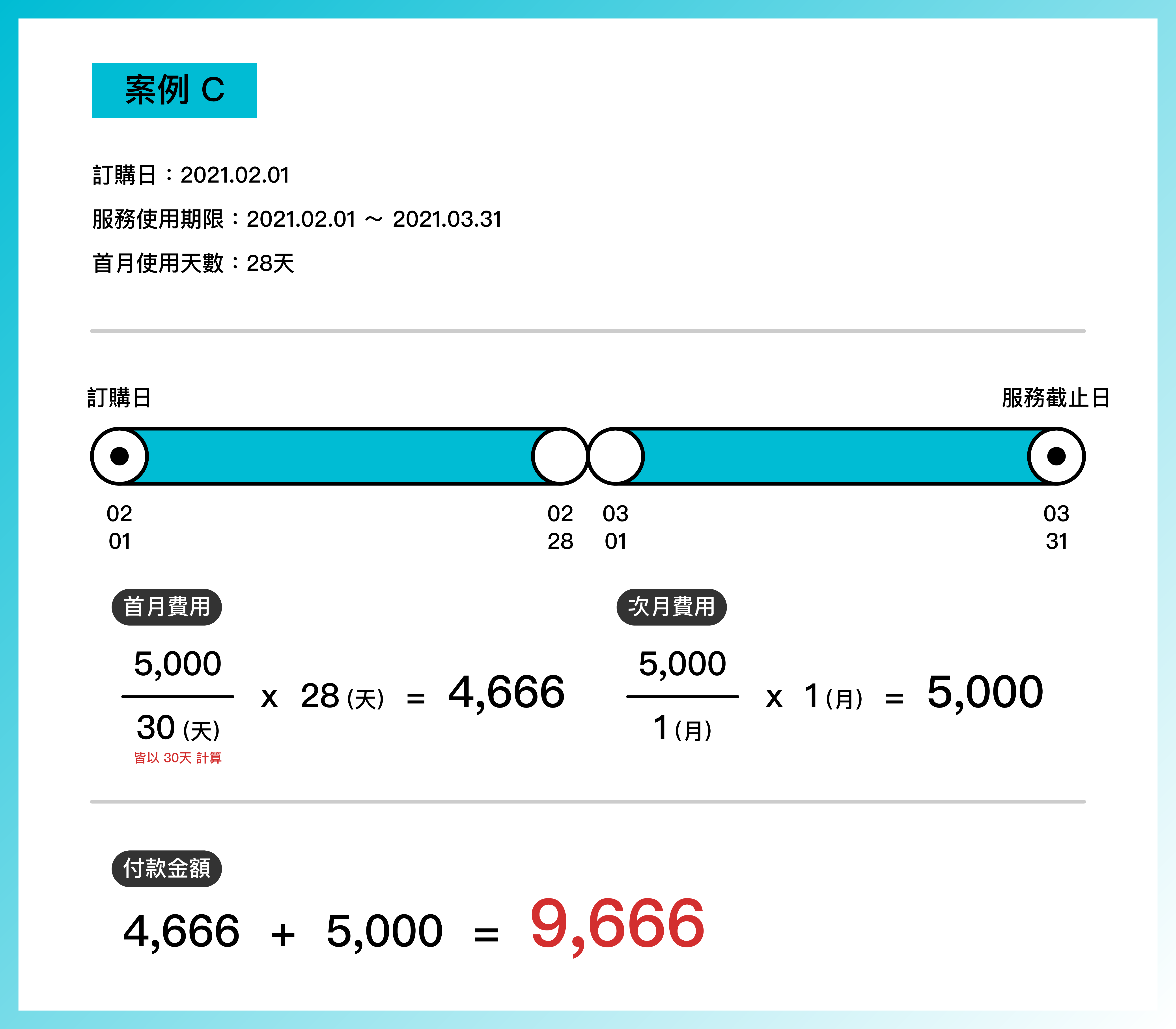 〈案例 C 〉中,雖然是於 2 月 1 日購買,首月的使用時間為完整的一個月,但我們仍會以「使用天數」計算首月的費用。同時,雖然 2 月份的天數為 28 天,但我們仍會以 30 天作為分母,來計算單日的服務費用。