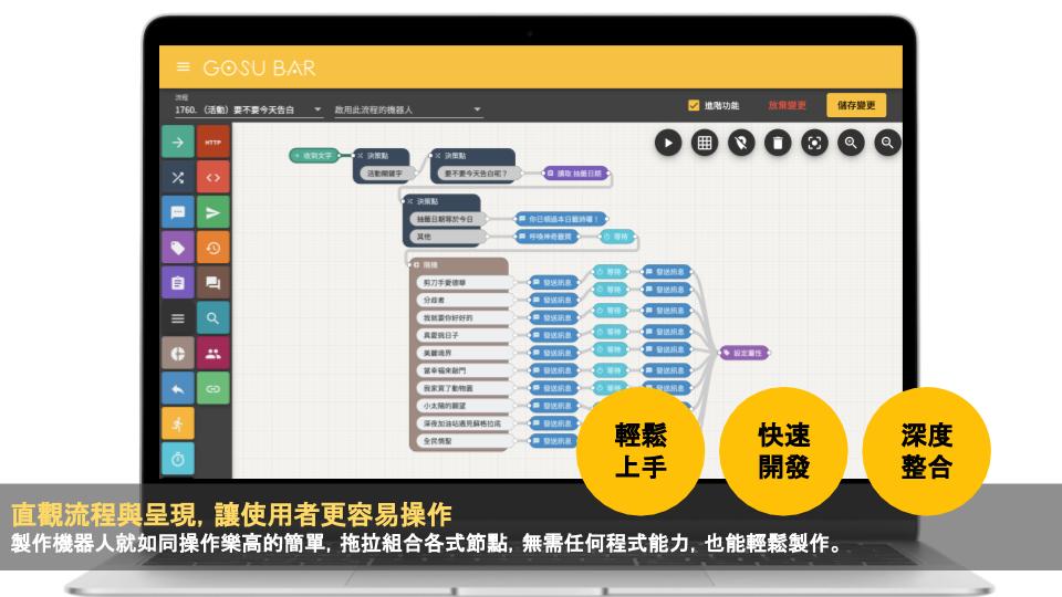由於 GOSU BAR 的流程編輯器,用最少的人力即可完成非常彈性化的對話腳本,還能製作多樣的主選單按鈕,並隨時編輯行銷活動、快速更新流程!