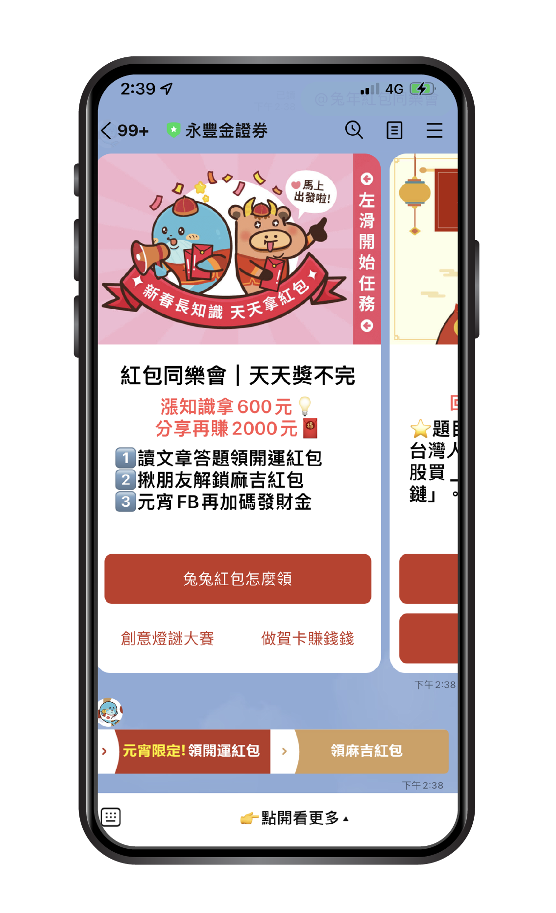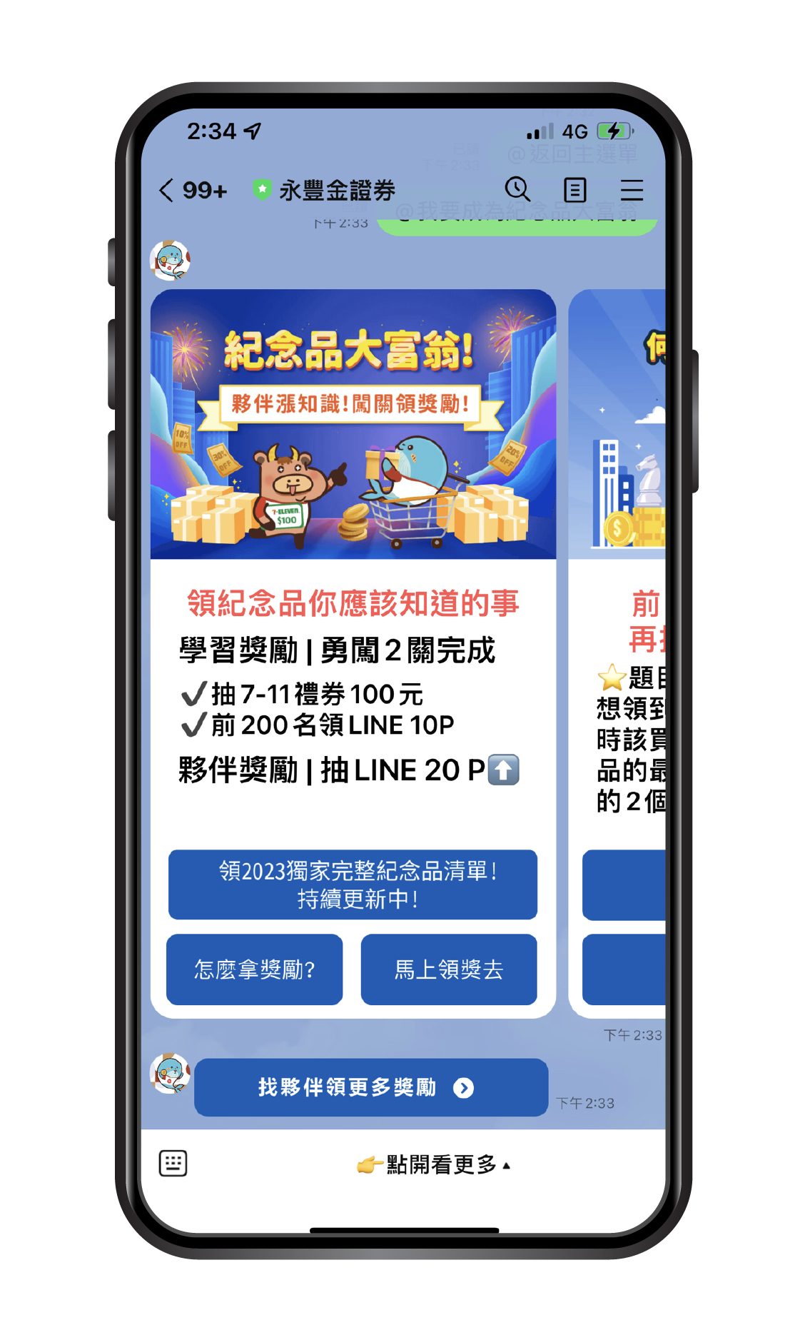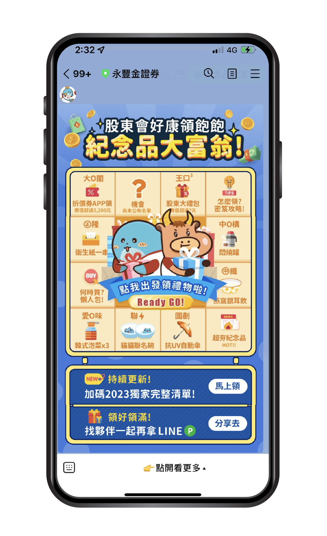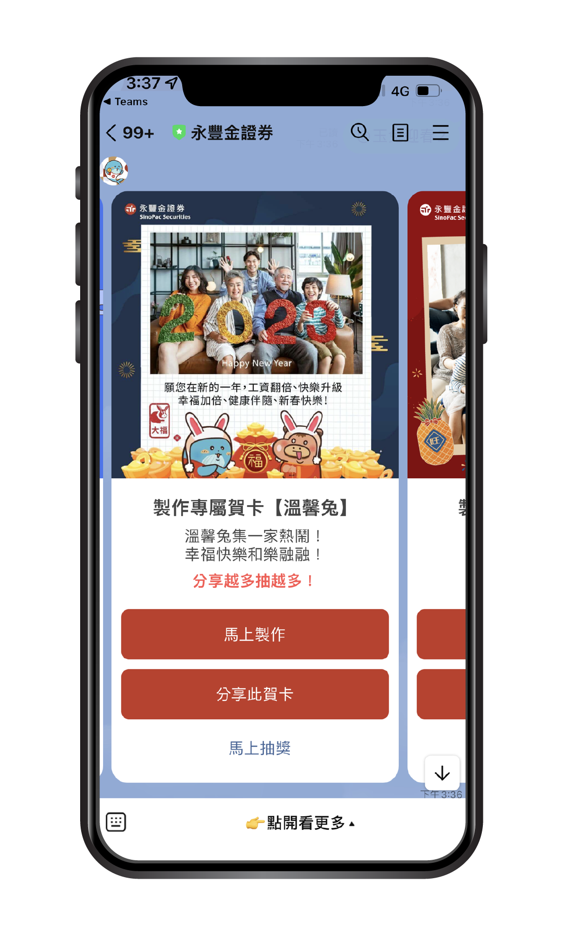 2023 兔年春節活動,電子賀卡 1.8 萬人次有效分享,紅包答題活動 2.1 萬次分享、 9.5 萬完成活動,並且創下單日新增 5 千好友紀錄。緊接著「夥伴漲知識」的問答活動,每一波都是破萬人參與,其中有以「股東會紀念品」的議題最為熱門,參與人數突破三萬人,2023 年至截稿前已經額外新增近 3.5 萬新好友,每日加好友數平均提升 200 %,內容點擊率平均提升 300 %。
