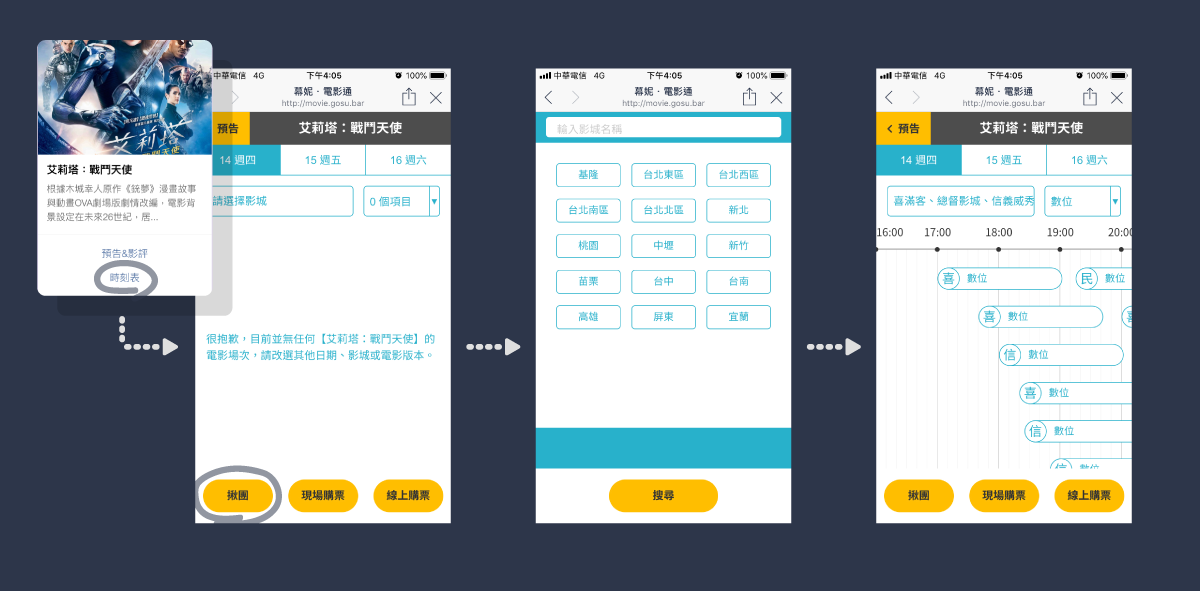 |STEP 1|點選幕妮卡片上的電影時刻表,進入頁面後上方勾選影城