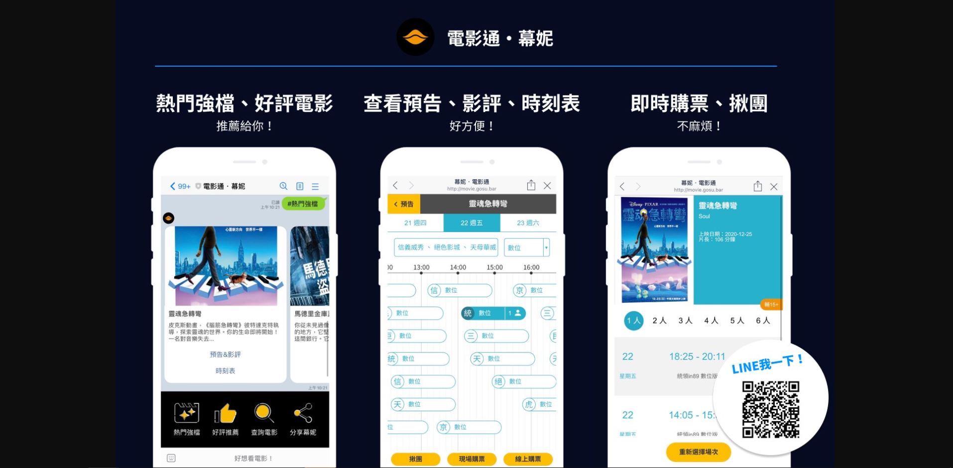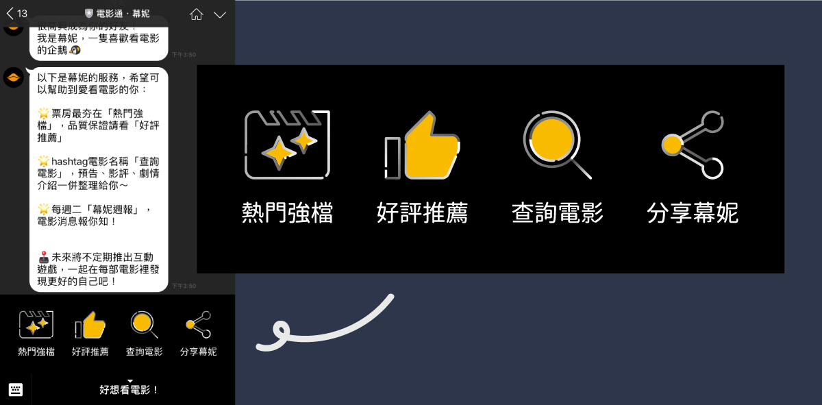 幕妮選單簡單易懂,只要點擊就可以在 LINE 裡查詢即時電影資訊!(後台直接跟 Ez 訂數據連結,不用再另外下載 app ,終於可以隨時隨地、可以輕鬆擁有電影情報啦~(如果幕妮還有可以更好的地方,歡迎留言讓我們知道!)