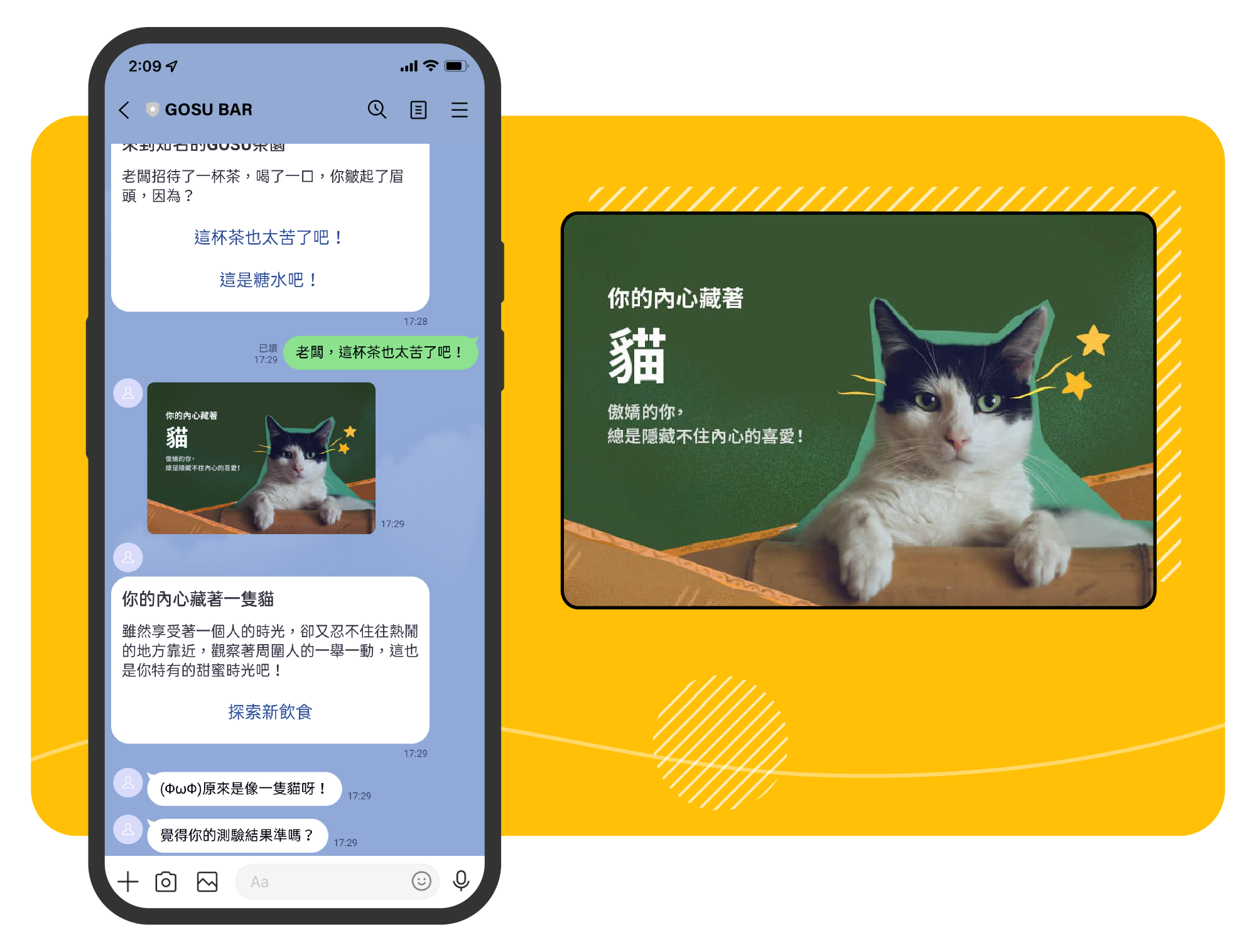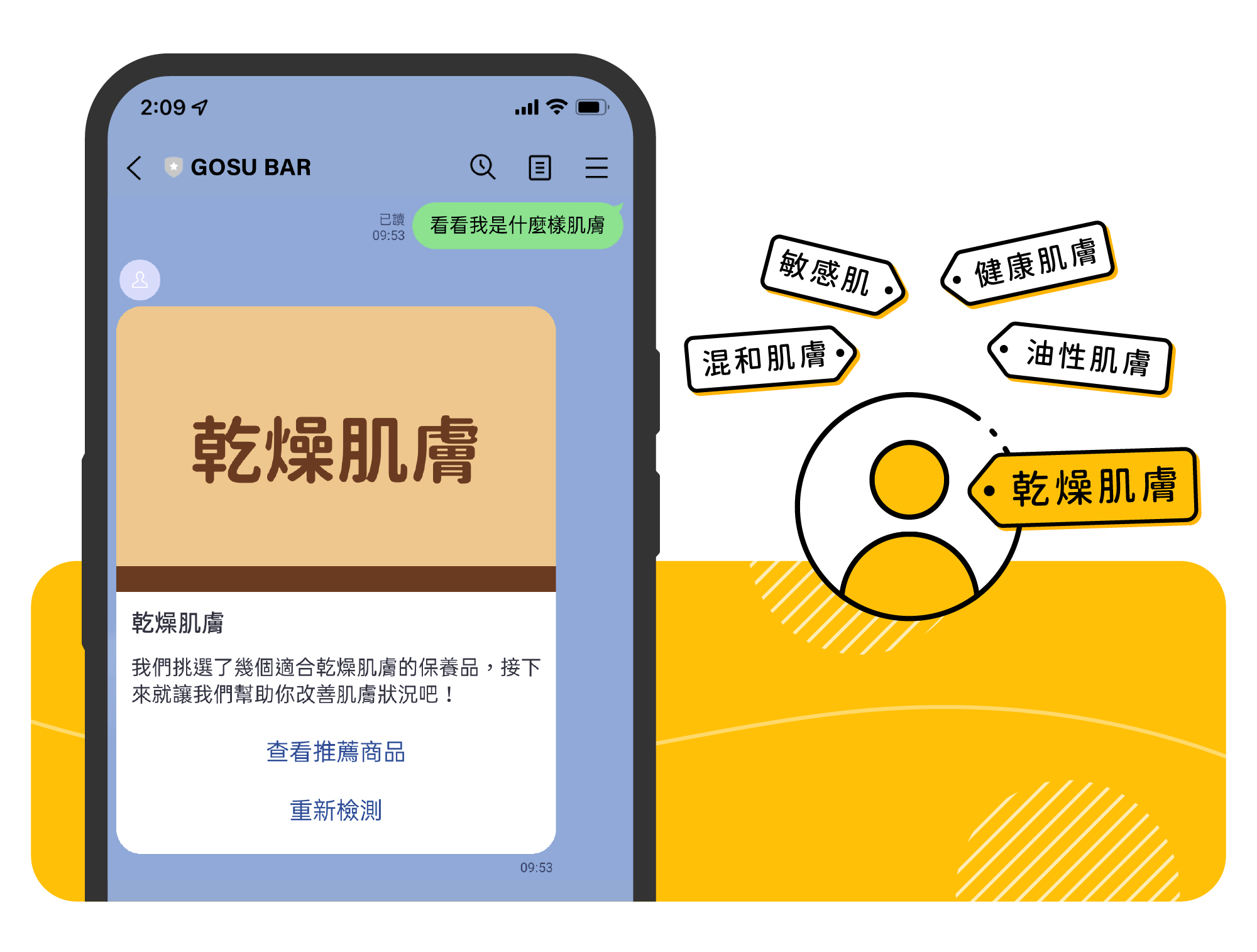 「想要全年無休、自動化推薦商品嗎?」透過人性化的問答,收集用戶的檢測結果並精準貼標,即時推薦用戶適合的商品,引導用戶增加購買意願。