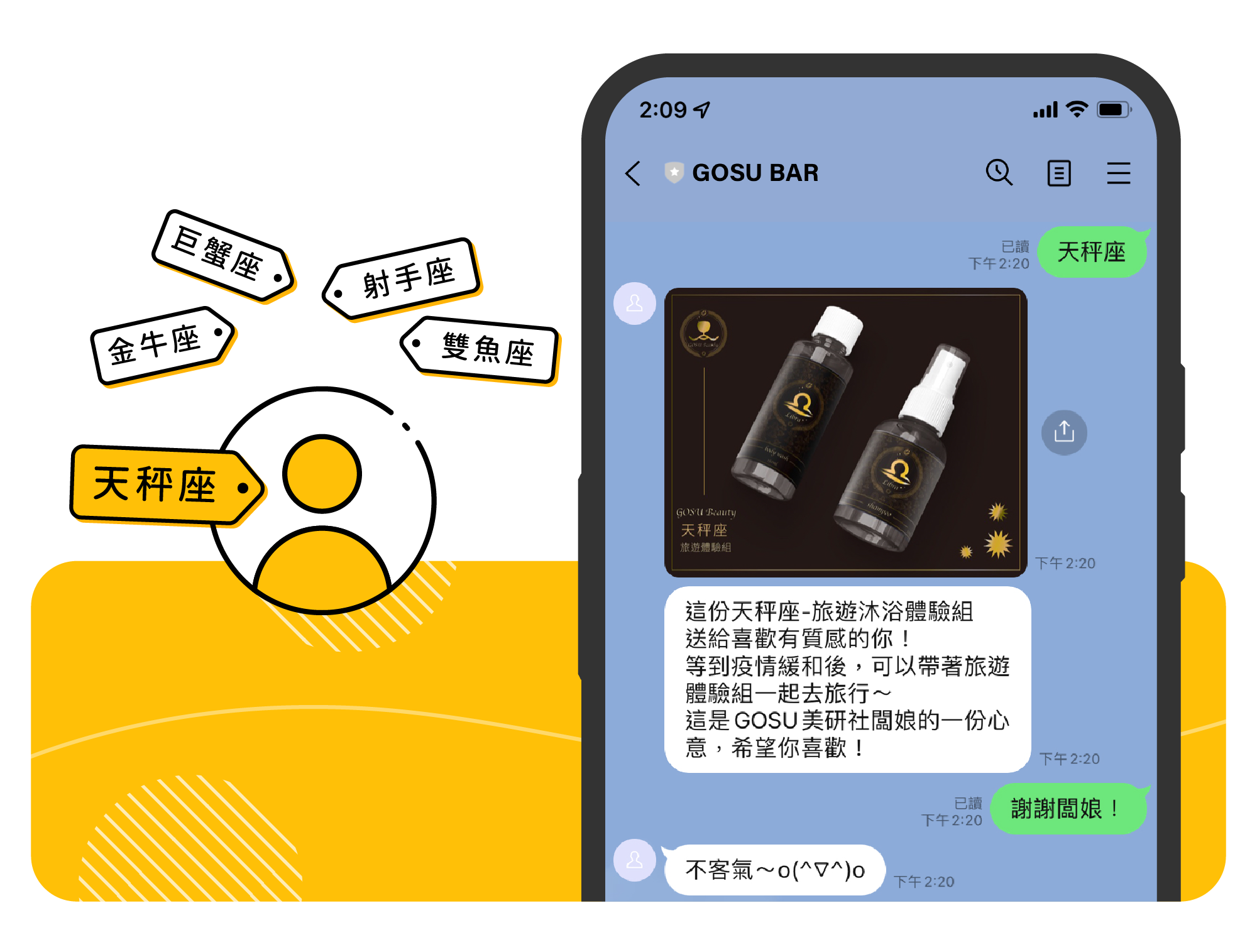 「不知道用什麼話題介紹商品嗎?」讓12星座幫您開啟聊天話題吧!透過星座導購應用範本,推薦用戶相關商品,同時,搭配幽默風趣的對白,進而引導用戶購買商品。