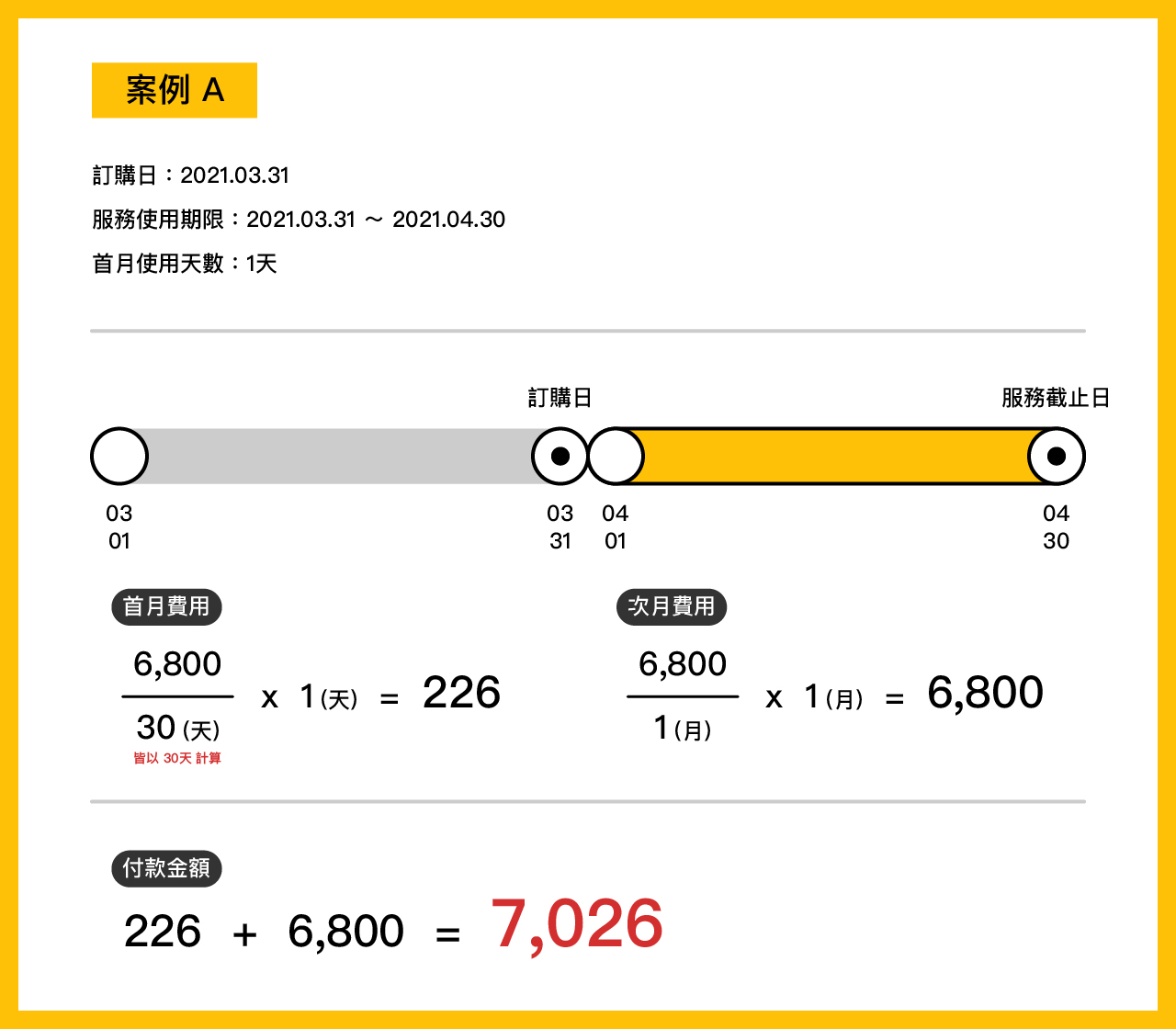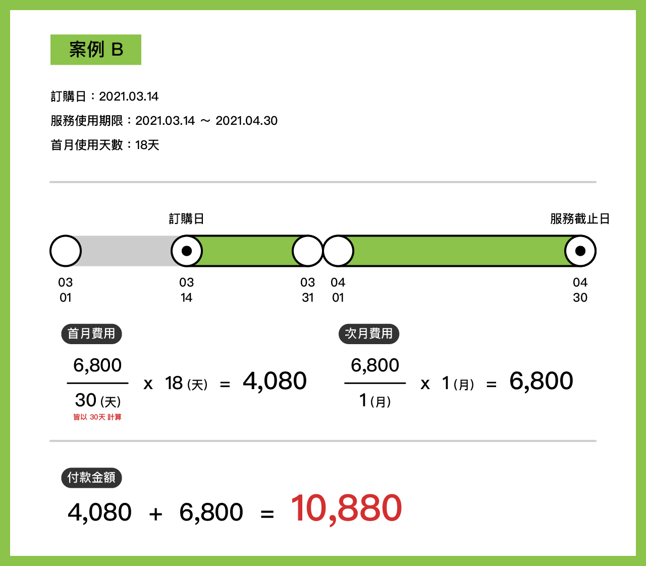 如〈案例 B 〉所示,首月費用統一以使用天數進行計算,次月費用則固定為 $6,800。
