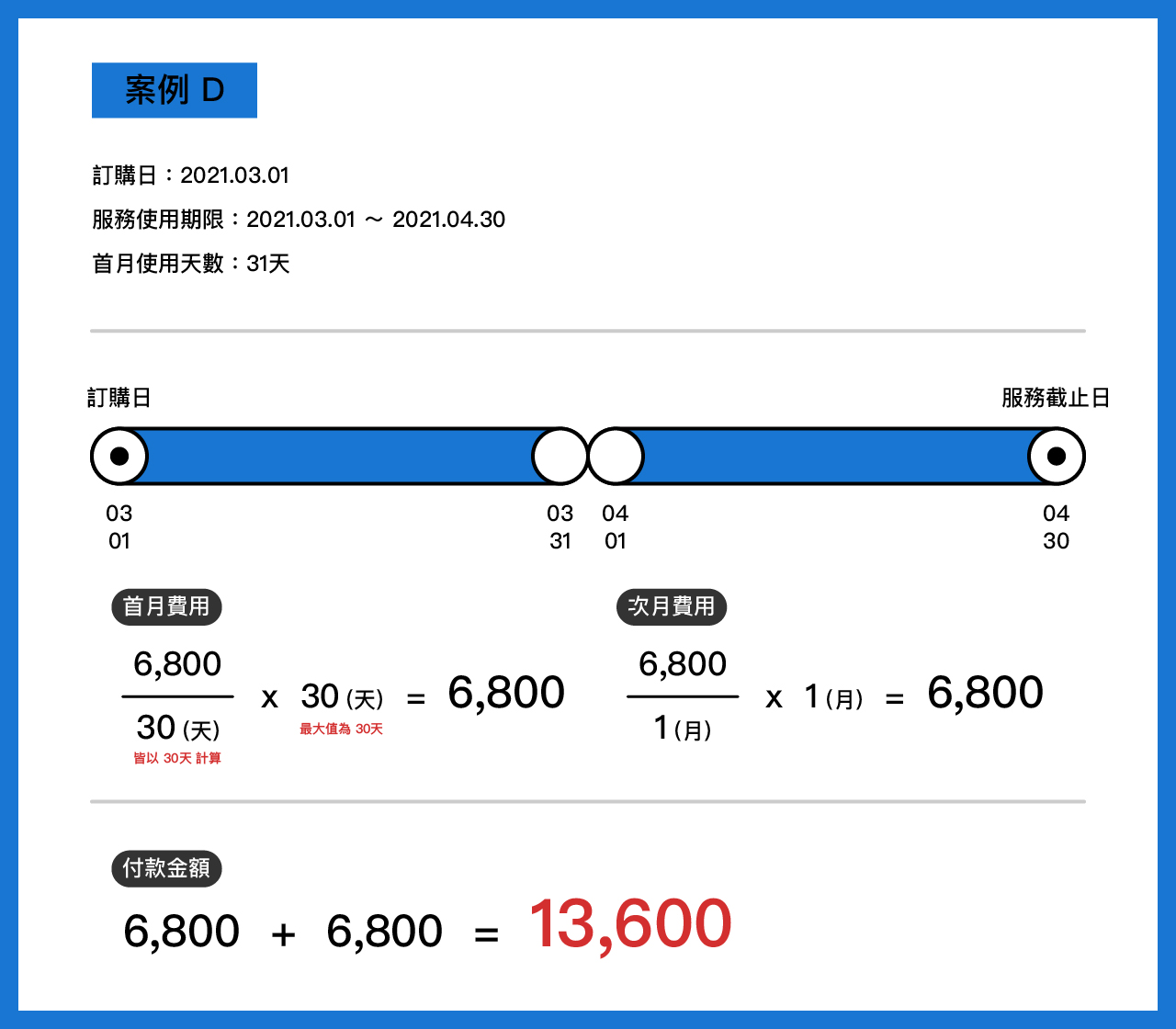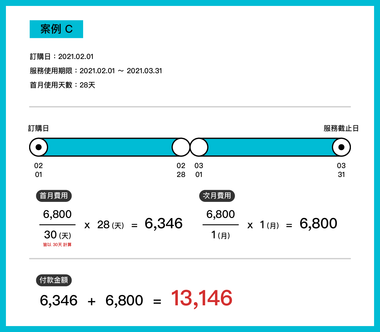 〈案例 C 〉中,雖然是於 2 月 1 日購買,首月的使用時間為完整的一個月,但我們仍會以「使用天數」計算首月的費用。同時,雖然 2 月份的天數為 28 天,但我們仍會以 30 天作為分母,來計算單日的服務費用。