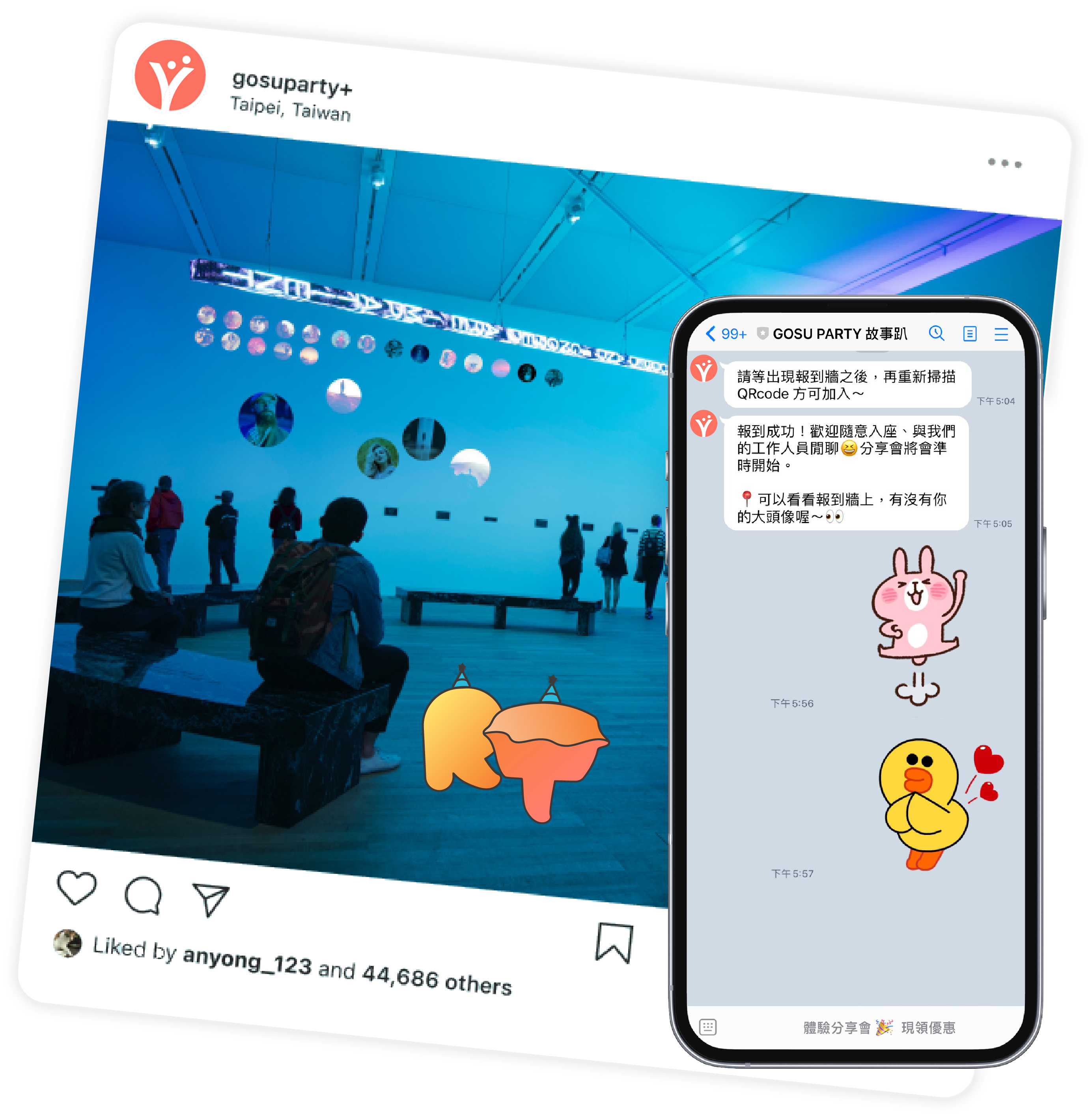 簽到形式改變,透過掃描 QRcode 的方式讓報到環節更流暢,同時提高活動的精緻度,並且將表格上的「名字」轉換成大螢幕上的「頭像」,增添親切感與討論度!